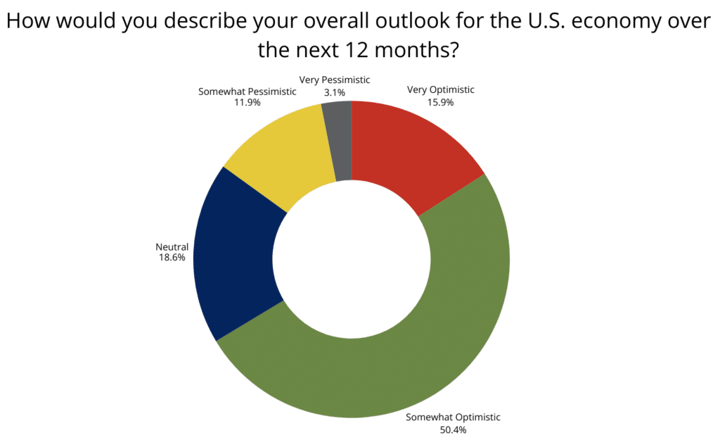 On the economy, respondents expressed somewhat mixed opinions, yet most have a positive view about the year ahead, even as public sentiment is a bit more downbeat. About two-thirds describe themselves as optimistic or somewhat optimistic. Roughly 15% fall on the pessimistic side and a notable share remains neutral. Across all sentiment categories, inflation and interest rates stand out as the top issues shaping client confidence levels.