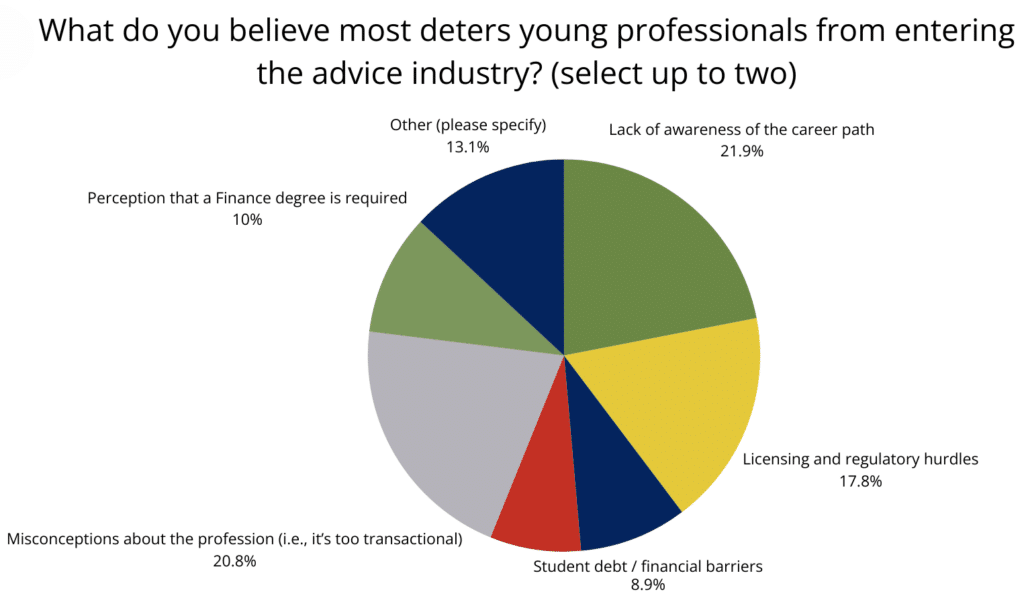 Talent dynamics add another layer of complexity. The survey reaffirmed a long-running challenge: The shortage of advisor talent continues to weigh on firms of all sizes. Respondents say the biggest reasons young professionals hesitate to enter the field are misperceptions about the role (38%) and limited awareness of a clear career path (35%). For firms trying to recruit, finding qualified candidates and managing compensation costs remain the primary hurdles. Many also note that building a book of business has become increasingly difficult for new entrants, for a variety of reasons.