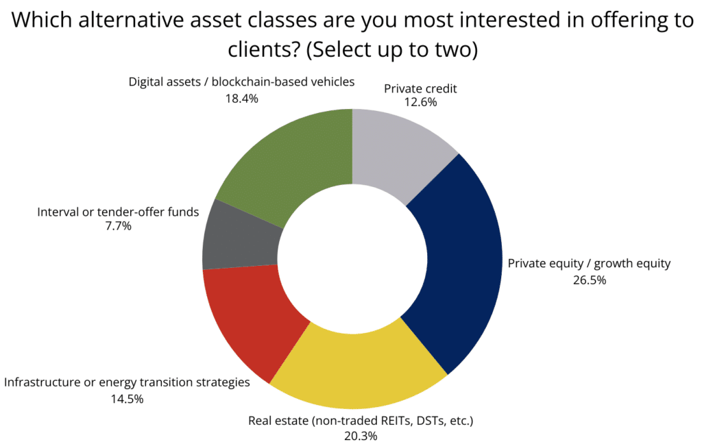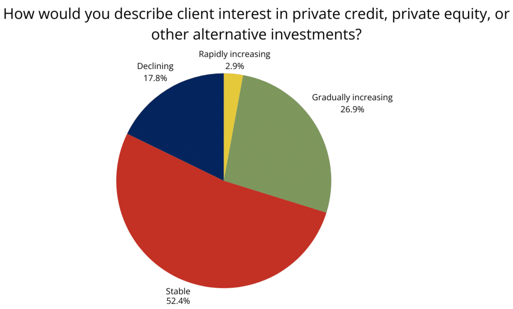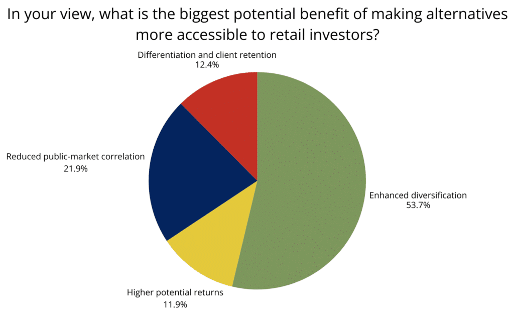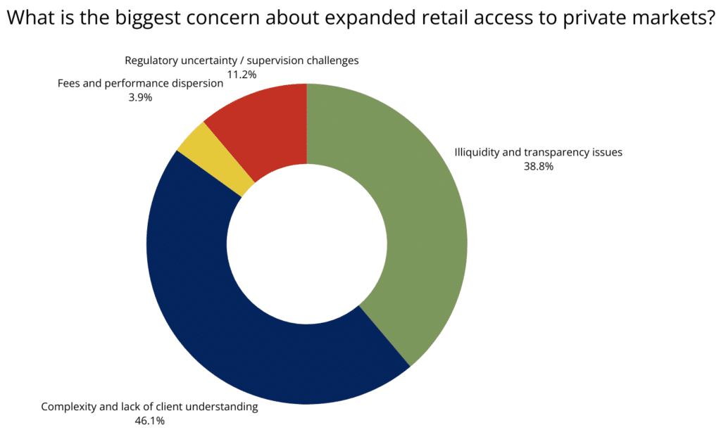 Respondents also continue to see changes in client preferences. An uptick in interest in alternatives mirrors broader trends across wealth management. Nearly a third report rising client appetite for private credit, private equity, real estate and other alternative strategies. Most of the remainder say interest is holding steady. The solutions generating the most attention are private equity and REITs. Respondents cite diversification as the chief benefit of expanding retail access to private markets, while pointing to illiquidity, transparency and complexity as the key risks.