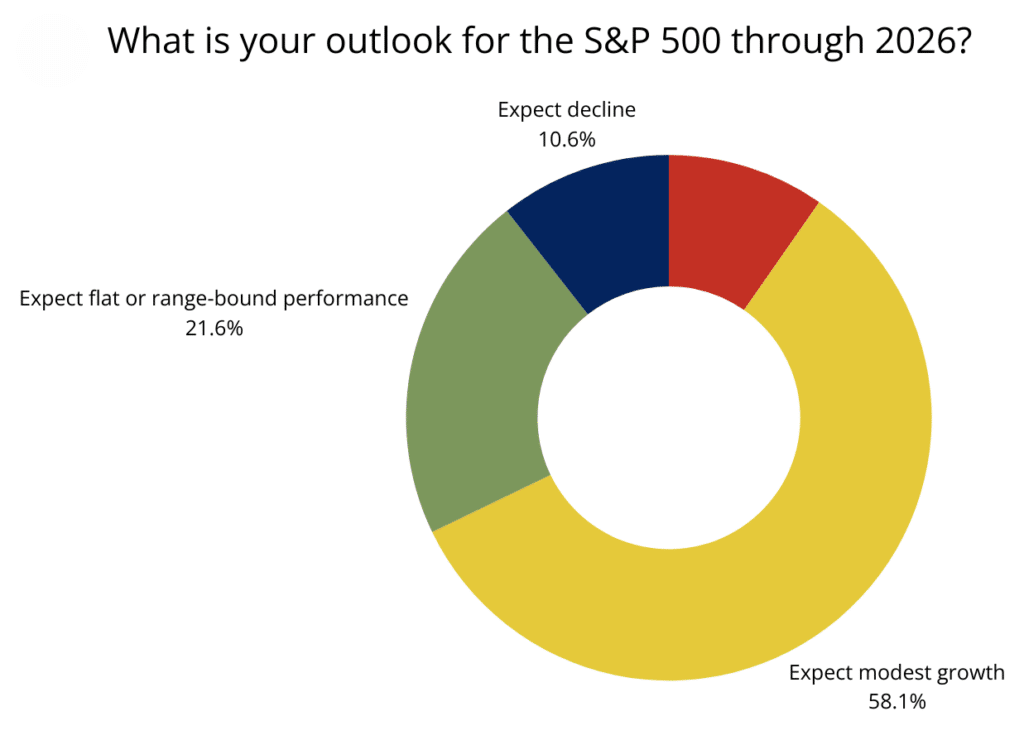 Views on the markets follow a similar pattern. Most have an upbeat outlook, and despite a noticeable uptick in volatility when the survey was conducted, the majority expect the S&P 500 to deliver gains through 2026. Nearly 60% anticipate modest growth and another 10% expect more meaningful advances. About one in five foresees flat conditions and a smaller group expects a decline.