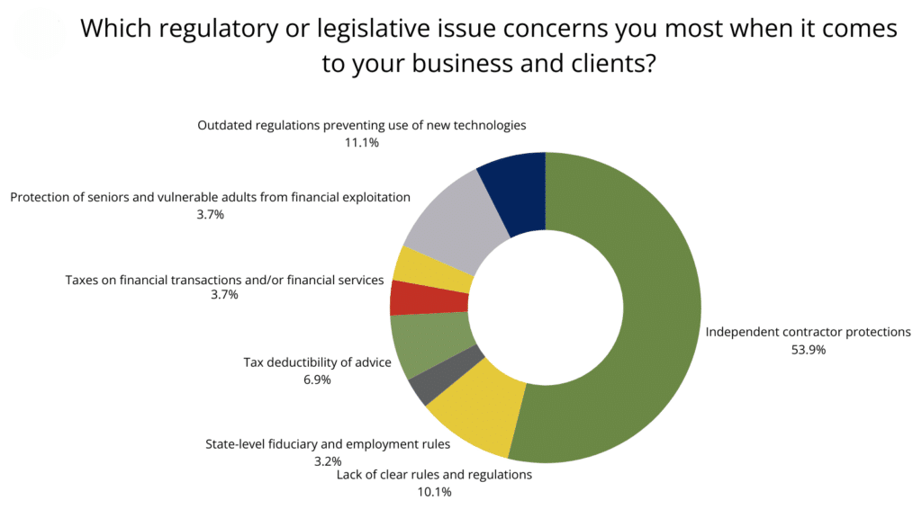 Against this backdrop, regulatory pressure remains a major source of strain and continues to shape how firms allocate time and resources. Independent contractor protections (54%) are the top concern by a wide margin. Respondents also cited unclear rules, state-level fiduciary requirements and proposed taxes on financial services as the top areas that could further complicate operations. A smaller segment pointed to the growing amount of time required for compliance tasks and the pressure these obligations place on smaller practices.