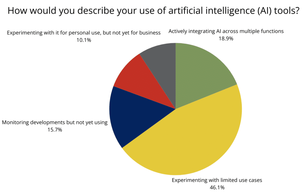Technology is another area where firms are weighing opportunity and risk. Technological advancements continue to influence advisor workflows, yet many firms remain early in their adoption journey. About 20% are actively integrating AI across key functions. Most, however, are either experimenting (46%) or watching developments carefully from the sidelines (16%).