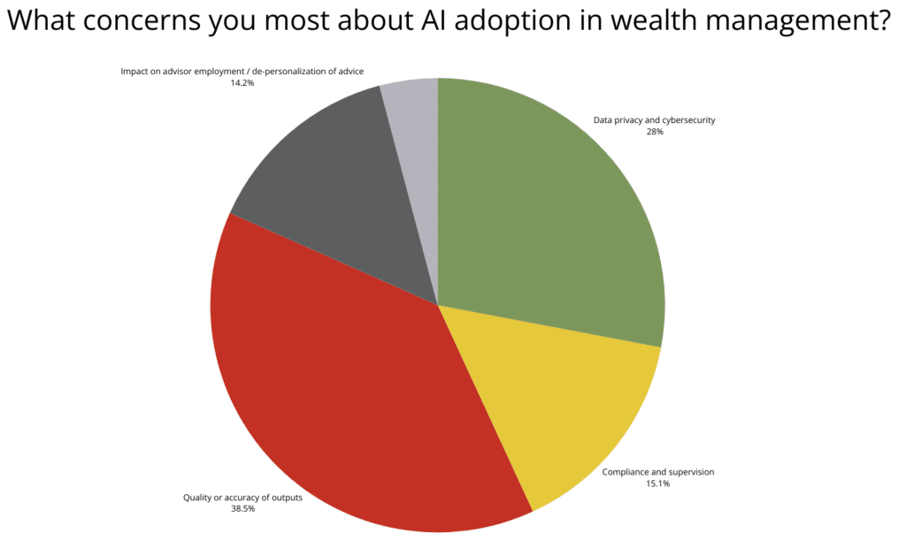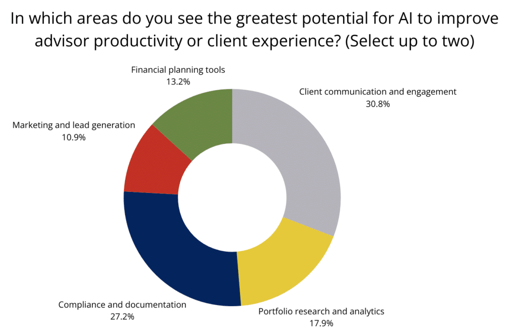 When asked where AI could add the most value, respondents highlighted client communications, portfolio research, compliance and planning support. Data privacy, oversight and accuracy remain the most significant barriers to implementing more AI-based tools within practices.